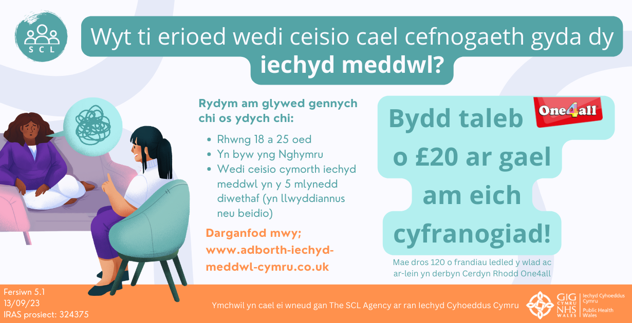 Mae Iechyd Cyhoeddus Cymru (ICC), ar y cyd gyda Asiantaeth SCL, yn cynnal prosiect ymchwil mewn i brofiadau pobl ifanc o chwilio am gymorth gyda’u hiechyd meddwl yng Nghymru dros y bum mlynedd diwethaf. Hoffai ICC glywed gan bobl ifanc sydd rhwng 18 a 25 oed a’n barod i rannu eu profiadau o chwilio am gymorth gyda’u hiechyd meddwl yng Nghymru. Maent yn awyddus iawn i glywed gan drawstoriad eang o bobl ifanc, gyda thrawstoriad eang o brofiadau o chwilio am gymorth e.e. trwy’r ysgol/coleg, trwy feddyg teulu, trwy elusen neu trwy gwnselydd preifat. Boed y broses o chwilio am gefnogaeth wedi arwain at dderbyn cefnogaeth neu beidio, mae ICC eisiau clywed sut beth ydy chwilio am gymorth gyda’ch iechyd meddwl fel person ifanc yng Nghymru ar hyn o bryd. Bydd SCL yn cynnal cyfweliadau gyda pobl ifanc sy’n mynegi diddordeb mewn cymryd rhan (a’n pasio’r meini prawf diogelwch), a bydd pob person ifanc sy’n cyfrannu yn derbyn taleb gwerth £20 fel diolch. Bydd y cyfweliadau yn digwydd hyd at ganol mis Rhagfyr 2023.